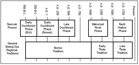 Data from elsewhere on the Alaskan Bering Sea coast can shed light on post-Norton subsistence patterns. The people of the Thule Tradition (after A.D. 1000) established the classic Arctic lifeway that continued until contact times. Evidence for early Thule occupations appears infrequently on the delta, although this is probably an artifact of the lack of archaeological investigation in the region. Shaw (1983) uncovered a late Norton component he terms the Yukon-Kuskokwim Phase (A. D. 400 1000) from 49-MAR-007, and a probable hiatus in occupation from A. D. 1300 to the recent past. The late appearance of net technology and bird remains at the site led Shaw to hypothesize that the people at the Manokinak River had adapted net technology for hunting waterfowl and small terrestrial mammals (Shaw 1982: 71 72). Ethnohistoric data from Nunivak (Hoffman 1990; Pratt 1990) also suggests that cliff-dwelling birds had become an important resource for Thule peoples. Avian resources added a fourth leg to Bockstoce's (1973) tripartite economy, making it generally more stable. By Thule times, Arctic hunters could operate solo or in small groups year-round, instead of relying on more labor-intensive and spatially and temporally restricted resource exploitation practices.