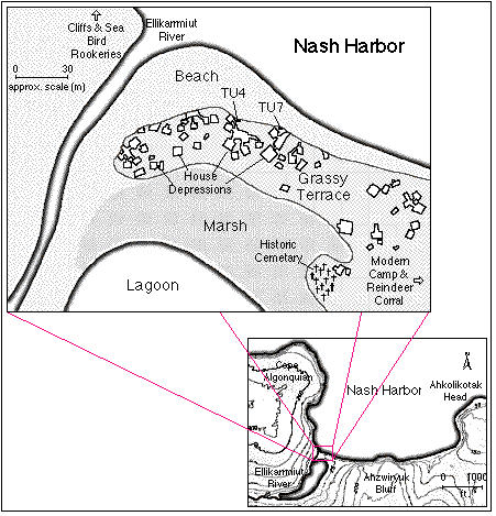 Part of the Nash Harbor Village is located atop a long sandy spit projecting west across a broad lagoon formed by the Ellikarrmiut River (Figure 2.1) . This spit nearly blocks the river, narrowing its outlet to about 5 meters. A grassy marsh has formed in the backwater behind the sand spit. Large subangular sand grains deposited in finely striated layers appear to comprise the basement material for Area 1. The tundra to the east of the site may have developed on rubble and igneous rock beach shingle eroding from Azwiryuk Bluff. On the beach exposure, these igneous rocks are rounded, flat stones 5 to 30 cm wide and 5 to 10 cm thick, well sorted by size and deposited in distinctly bedded planes interspersed with coarse beach sands. This suggests that the tundra east of Ellikarrmiut is formed on top of a series of shingle backbeaches (Bird 1984:112) similar to the beach east of the village today.