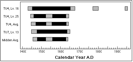 Radiocarbon-dating results from the Test Unit 4, Level 16 sample (above Feature 1) yielded a conventional radiocarbon age of 340 +/- 80 R.Y.B.P. Owing to multiple intercepts with the calibration curve, calibration at the 2 sigma level yielded three ranges calendar dates: A.D. 1425 to 1675, A.D. 1770 to 1800, and A.D. 1940 to 1950. Calibration at the 1 sigma level generated a more narrow range of possible dates, A.D. 1455 to 1655. Results from TU4, Level 25 yielded a conventional radiocarbon age 370 +/- 40 R.Y.B.P.; at 2 sigma this represents calendar dates of A.D. 1445 to 1645 (2 sigma), and A.D. 1460 to 1525 and A.D. 1560 to 1630 (1 sigma). The close probable ages of these two samples suggested that these units are statistically identical. Two-tailed t-distribution and chi-square testing showed these samples to be the same at the 95% level (T' = .11; X2(.05) = 3.84). I then computed pooled average dates for the TU4 samples, yielding a radiocarbon age of 364 +/- 36, with calibrated calendar ages of A.D. 1446 to 1644 (2 sigma), and A.D. 1471 to 1526 and A.D. 1556 to 1632 (2 sigma).