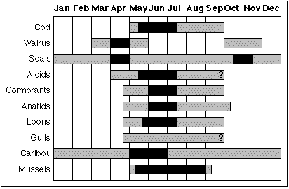 terrestrial mammal, and sea mammal resources, focusing on cod, seals, walrus, cormorants,