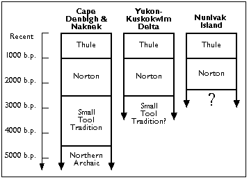 In their analysis of Small Tool Tradition adaptations, Dumond (1986b) and Dumond and Bland (1995) outline a broad-based interior-oriented economy focused on riverine and large terrestrial mammal resources, with occasional forays to the "sea-edge," apparently for the purpose of sealing. Lutz (1982) interprets the shift to marine resources at the end of the Small Tool Tradition as a response to worsening winter conditions in the interior of Alaska. Anderson (1986, 1988) believes that Denbigh and other Small Tool Tradition sites represent seasonally-variant emphases: summer sealing camps found near the coast alternating with caribou hunting settlements found in the interior.